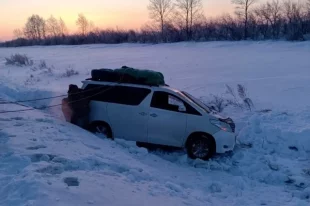 В тяжелых погодных условиях на Алтае микроавтобус слетел с дороги