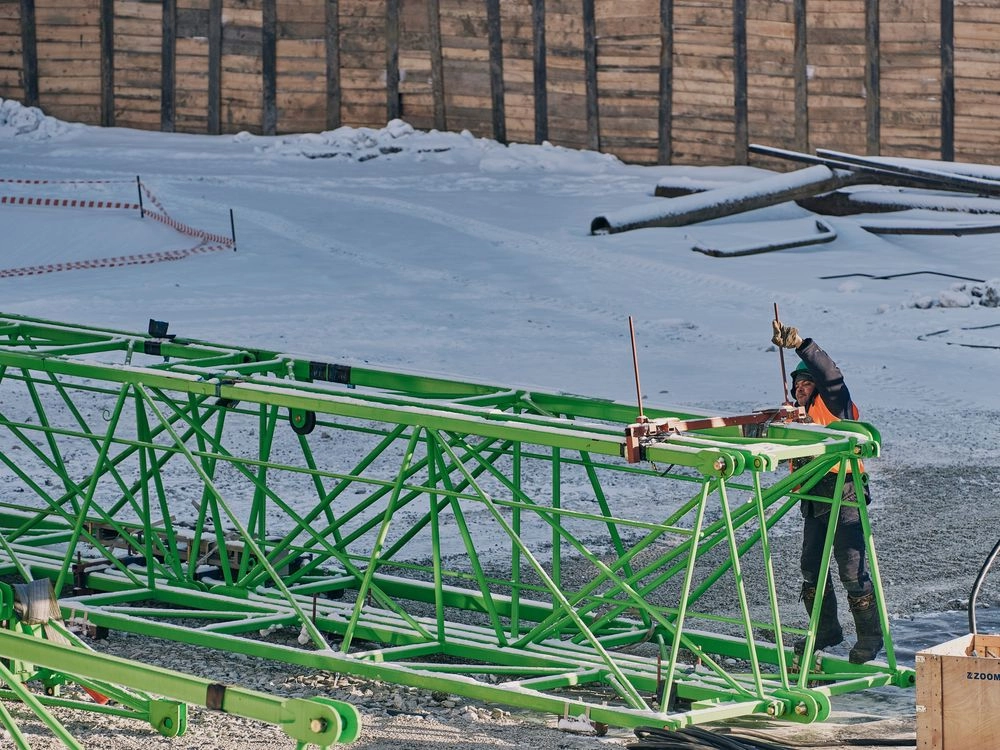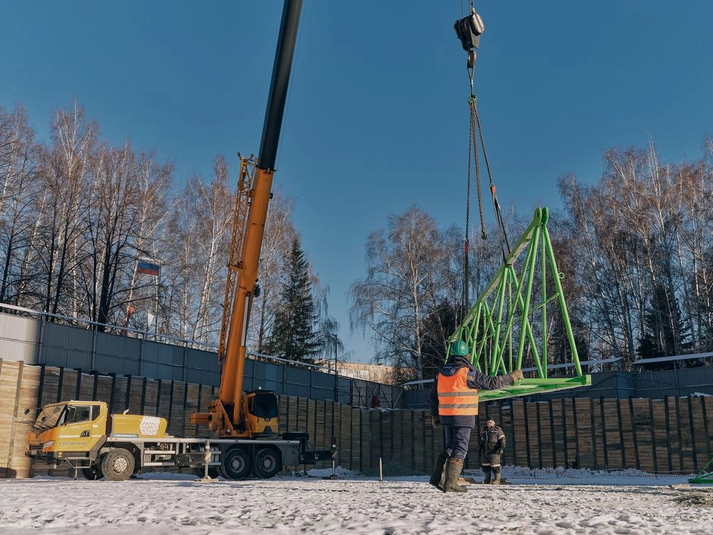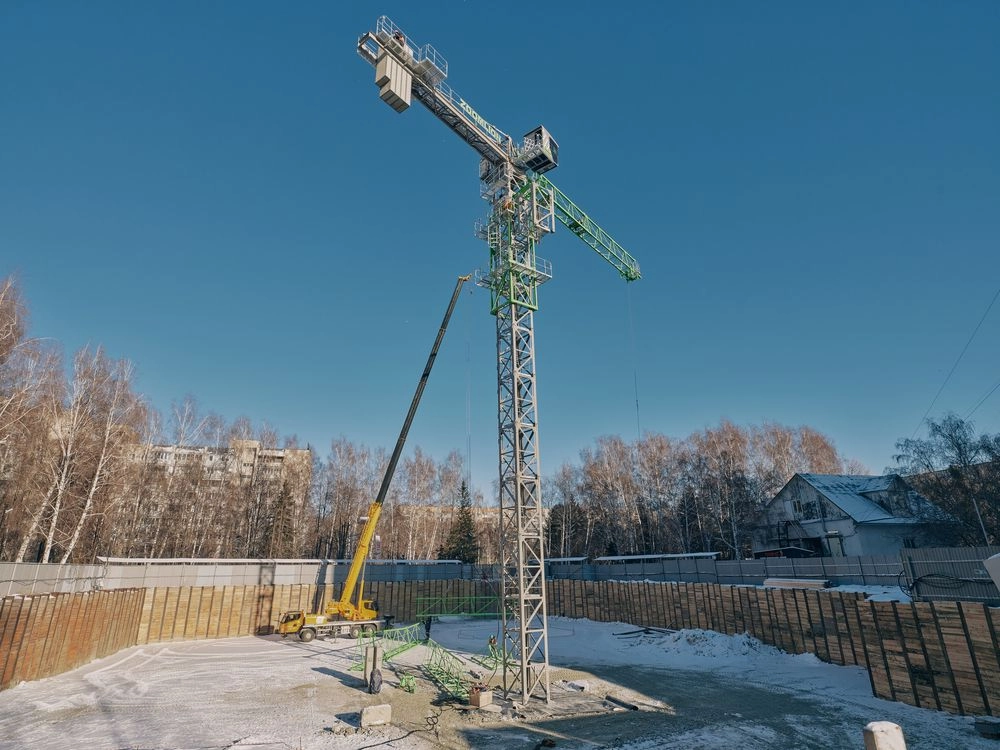 Кран станет основным инструментом для строительства процессов и ключевым условием для точного соблюдения установленных сроков. Установка «стального гиганта» проводилась в несколько этапов. Сначала было выполнено бетонное основание под фундамент крана. Затем забетонирована сама фундаментная плита, которая удерживает конструкцию. После этого бригада монтажников приступила к сборке: были установлены секции башни и смонтирована стрела крана марки Zoomlion.