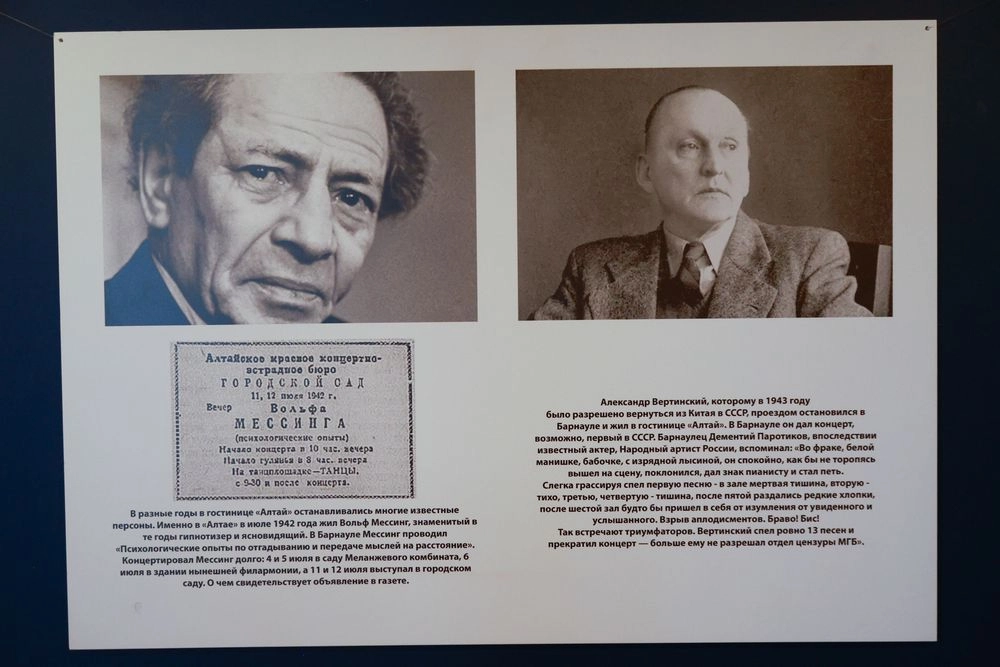 Гостиница «Алтай» имеет богатую «портретную галерею» знаменитых гостей: от Вольфа Мессинга и Александра Вертинского, давшего здесь первый после возвращения из эмиграции концерт, до Эльдара Рязанова, Владимира Высоцкого и современных звезд, включая Ольгу Бузову. Портреты известных гостей размещены на стенах этажей, и в планах — обновить галерею в новом формате и проводить экскурсии по зданию. Это станет частью соглашения с администрацией города, направленного на сохранение исторической идентичности и развитие различных видов туризма.