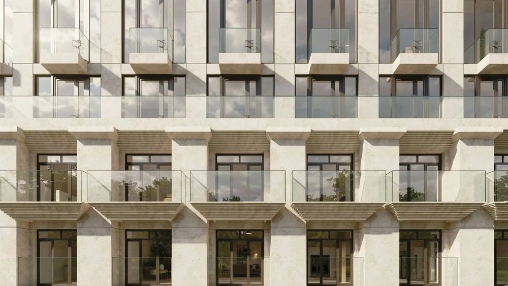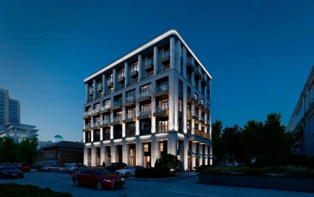 В этом случае дом будет выполнен в нейтральных теплых оттенках. Его дворовый фасад акцентируют объемной декоративной решеткой, за которой жильцы дома смогут расположить системы кондиционирования. Предусмотрена подсветка в классическом стиле, которая подчеркнет колоннаду и строгость вертикальных форм. Основные фасадные материалы — плиты, имитирующие травертин, и композит под медь. Присутствуют штукатурные элементы.