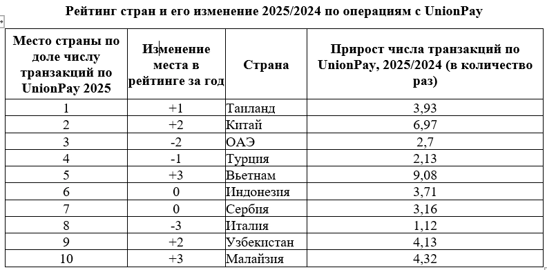 «Сейчас топ-10 стран по числу транзакций по картам UnionPay наполовину формируют государства Восточной и Юго-Восточной Азии: Таиланд, Китай, Вьетнам, Индонезия и Малайзия, а страны Запада утратили позиции. Особенное внимание обращает на себя Китай. На него приходится 20% заграничных транзакций в 2025 году, а если проанализировать август, то видим увеличение числа трат в 4,6 раза год к году. С учётом прогнозируемого роста турпотока на 30-40% после введения безвизового режима мы видим возможности для многократного наращивания числа операций», – заключила Людмила Корсакова.
