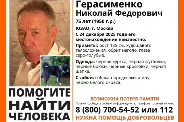 О том, что пропал Николай Герасименко, стало известно накануне. В СМИ сообщалось, что 24 декабря он отправился на прогулку со своей собакой акита-ину по кличке Кей и не вернулся домой. Поисками занимались волонтеры.