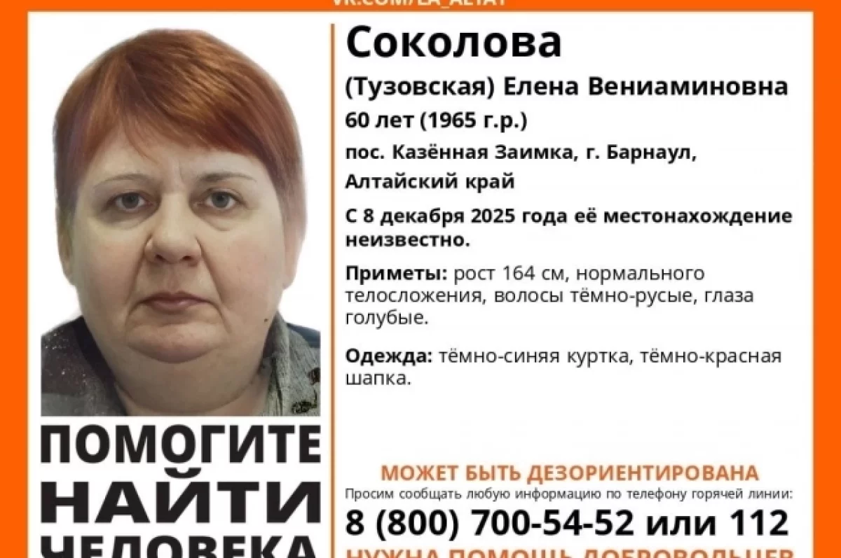 В барнаульском поселке Казенная Заимка пропала 60-летняя Елена Соколова (Тузовская). Об этом сообщают волонтеры поисково-спасательного отряда «Лиза Алерт».