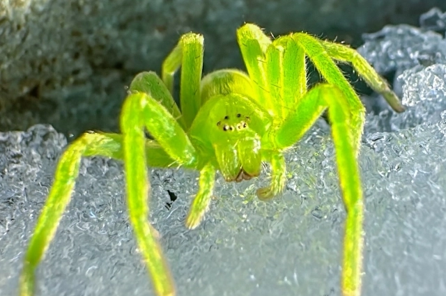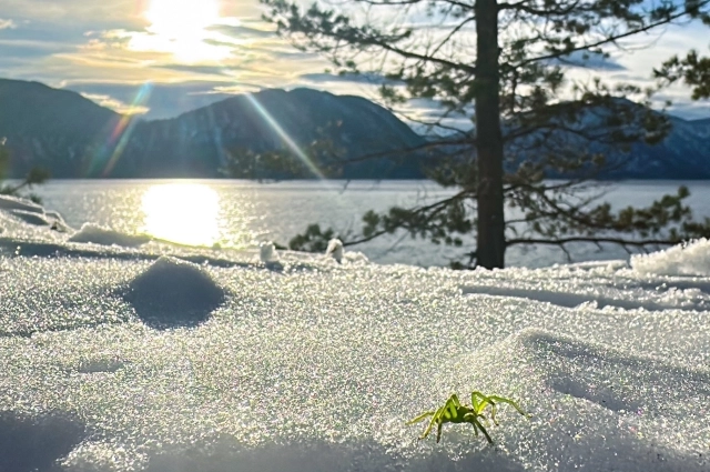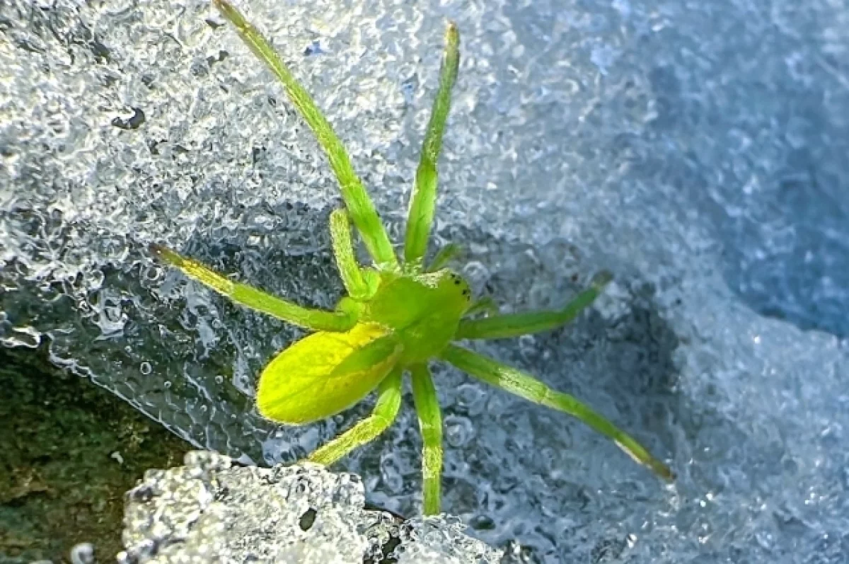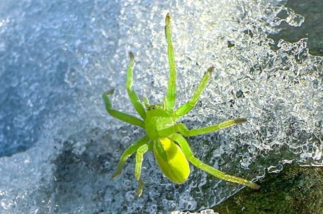 По словам Романа и Татьяны, последние несколько дней на Алтае установилась плюсовая температура. Днем столбик термометра поднимется до +6 градусов. Снег стал рыхлым, и появились проталины, а из-под них выбрались на солнышко маленькие снежные жители. На фото специалистов попала микромата зеленоватая (Micrommata virescens). В летнее время ядовито-зеленый паучок-бокоход охотится в траве — в отличие от своих собратьев он не плетет ловчие сети. Встретить восьминогих хищников можно на берегах Телецкого озера.
